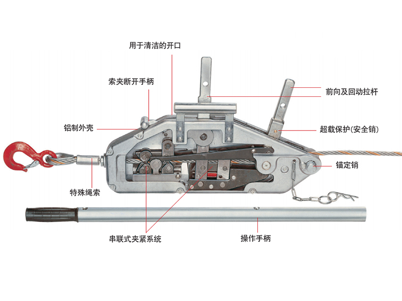 ●采用前后兩個(gè)獨(dú)立的手柄操作桿設(shè)計(jì)控制鋼絲繩的拉緊及松開動(dòng)作,整個(gè)機(jī)體小巧緊湊,并保證拉力沿中線傳送。